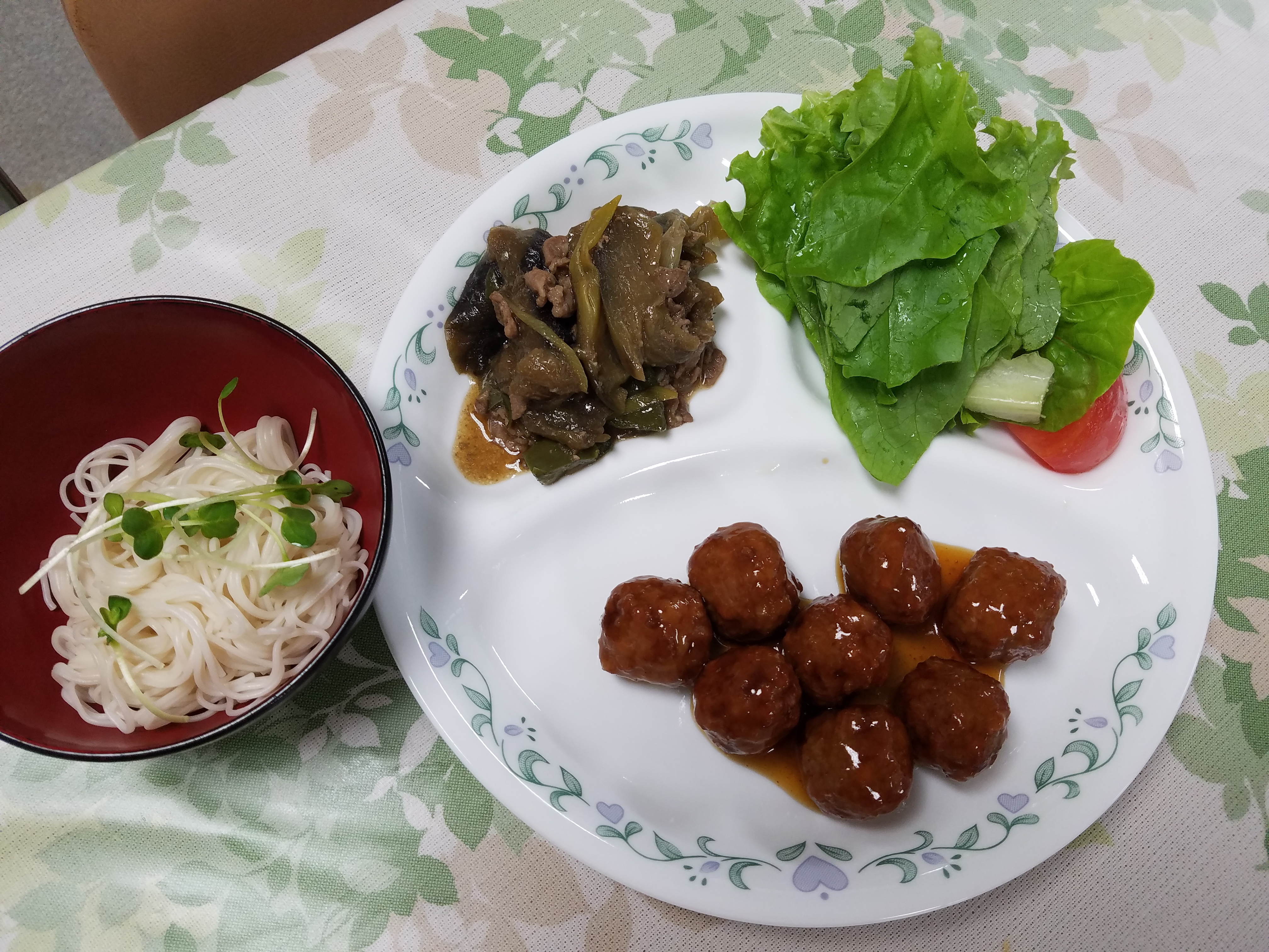 肉団子の甘酢あんかけ サラダ 茄子のオイスターソース炒め そうめん汁